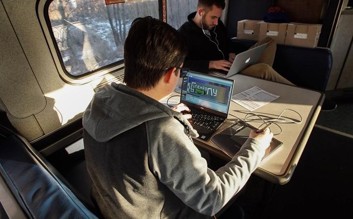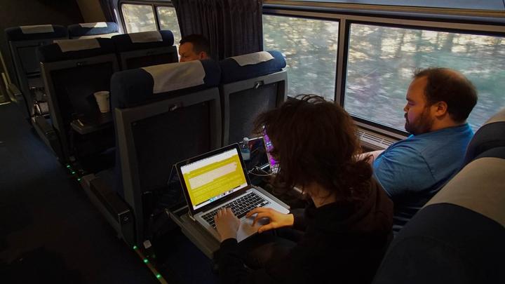讽刺意味的是,我以最“模拟”而非数字化的方式了解到Synchrony演示聚会的存在:我在纽约的一个科技杂志展会上看到了它的广告海报。出于对在跨国列车上举办一整天的编程马拉松的兴趣,我联系到了Synchrony的创始人麻省理工学院媒体领域的教授兼数字艺术家Nick Montfort来了解有关该活动的更多信息。