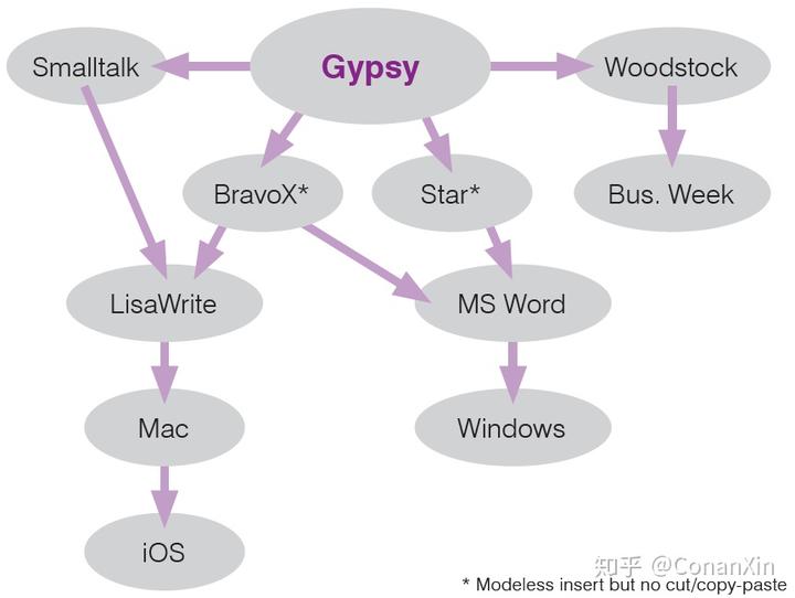 Gypsy也影响了BravoX和Xerox Star。BravoX是查尔斯·西蒙尼(Charles Simonyi)在PARC开发的Bravo的继承者。Star是第一个带有鼠标、位图显示、窗口和文件服务器的商业办公系统。Star有一个完全一致且近乎无模态的用户界面。
