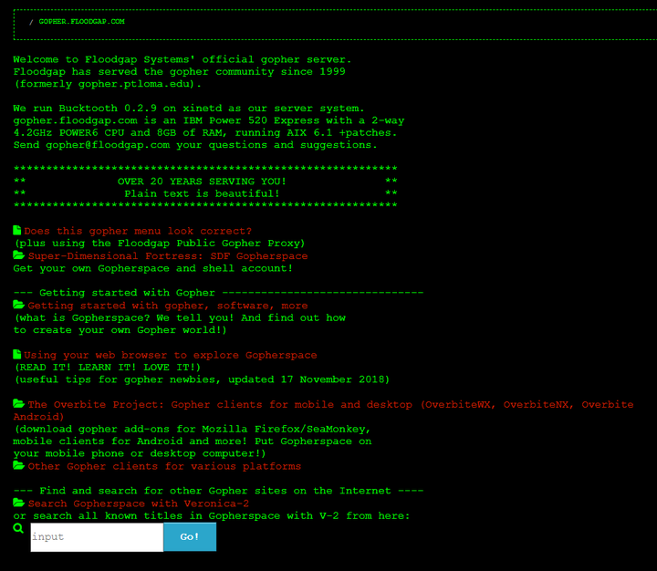 大家可以体验一下目录形式组织的互联网信息服务Gopher,使用右上角的配色主题功能可以把它切换为非常复古的黑底绿字模式