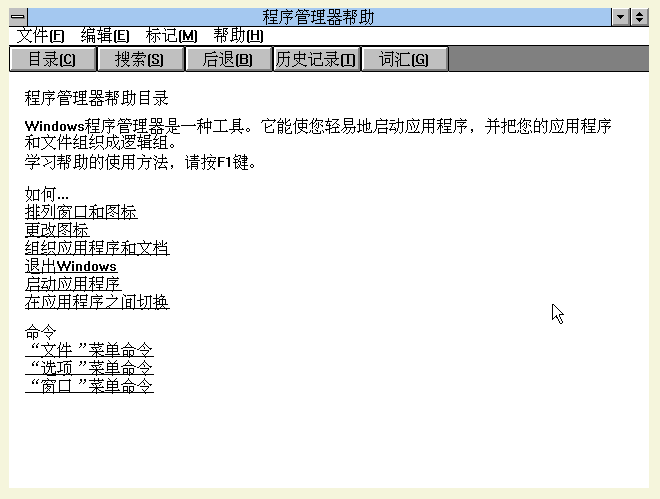 而另外一个非常重要,但是却常被忽视的超级文本的实现是Windows的帮助文件,那么我们在Windows帮助文件里同样可以找到超链接跳转这样典型的超文本特性。在网页里的电脑博物馆的Windows 3.2模拟器里,可以翻阅早期的Windows帮助文件。