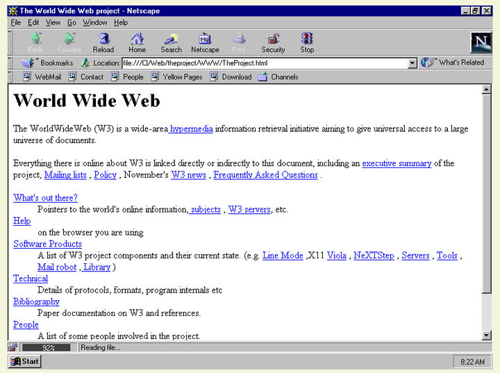 当然最重要的超文本形式还是万维网,在网页里的电脑博物馆里,大家可以看到最古老的www网页:The WWW Project。万维网出现之后得到了快速的发展,超越了以目录形式组织的Gopher成为了最被广泛使用的信息浏览工具,和最重要的互联网功能。