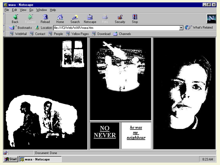 快速发展的万维网技术很快具备了能够实现艺术作品的表现力。比如说1996年,奥莉雅·莉娅丽娜(Olia Lialina)的作品《我的男友从战争中归来》就是使用了当年最新的网页框架(frame)技术创作的交互艺术作品。虽然HyperCard也可以用来构建复杂的交互体验,如游戏《神秘岛》(Myst)就是使用HyperCard开发的,但www却具备HyperCard所没有的网络传输功能,可以按需下载要访问的内容而不需要全部下载到本地执行。