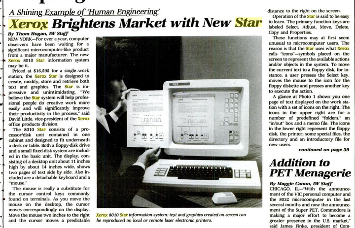 但是Xerox的Star电脑最大的问题就是非常贵,它在1981年的价格是16,595美元,大概相当于今天的47,000多美元,因此直到80年代中期桌面出版仍然是一件非常曲高和寡的事情。桌面出版的成本真正降到可以接受的程度还要等到苹果Macintosh电脑出现之后,在它上面诞生了一款非常著名的软件叫PageMaker,这个软件后来成为了出版界的行业标准,许多人都用过它及其继承者Adobe Indesign。