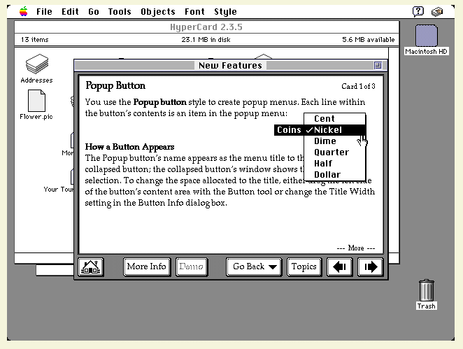 在网页里的电脑博物馆的Macintosh II里面就安装有HyperCard,类似于万维网中的“网页/页面”概念,HyperCard的基本组织单位是卡片,通过卡片上的交互元素,观看者可以在卡片中跳转,也可以从一摞或一堆(stack)卡片,跳转到另外一摞卡片中去,就像在网站之间跳转一样。HyperCard被人们广泛使用,并影响了一系列万维网早期的开发者。比如说最早的万维网浏览器之一ViolaWWW的华人开发者魏培源就是受到了HyperCard的启发而开始开发浏览器的。