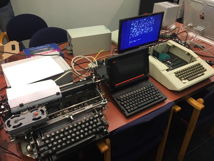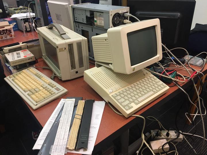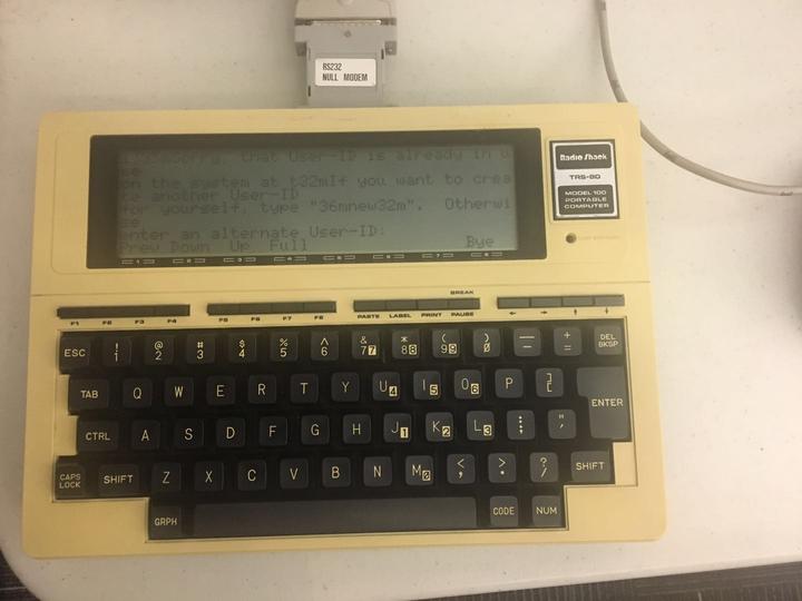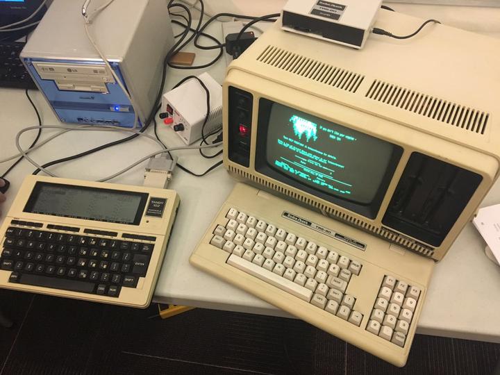 TRS-80 Model 4P和Tandy 102(TRS-80 Model 100的改进型)便携式电脑,后面的浩鑫(Shuttle)准系统上面运行的是BBS软件,两台Tandy电脑都通过串口连接到BBS上。