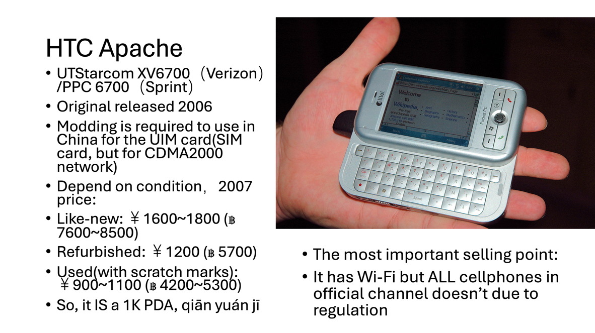 “洋垃圾”手机的另一个代表是HTC Apache,也叫做UT斯达康XV6700或PPC 6700,它是在2006年发布的。实际上,它并没有在中国正式发布,大部分都在美国销售。当这些手机作为“洋垃圾”进入中国时,它们被改装并添加SIM卡或UIM卡的功能,从而能够在中国的CDMA2000网络中使用。
