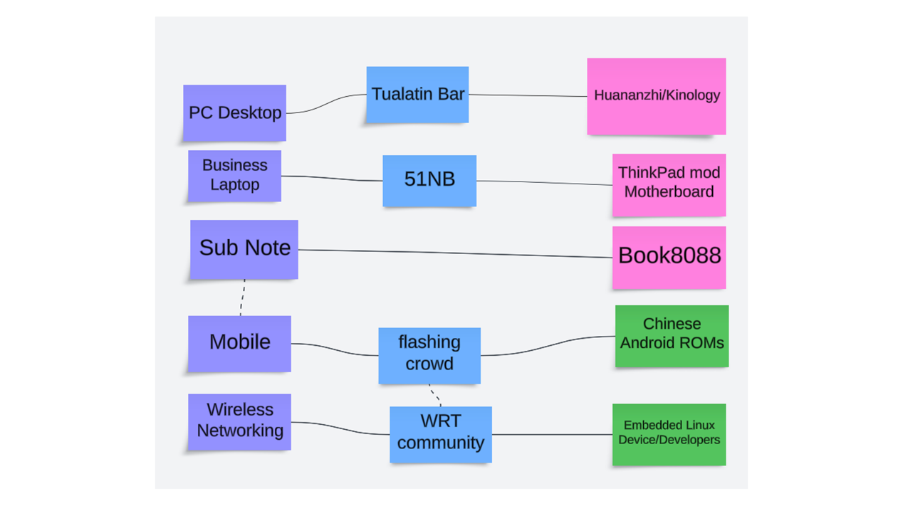 我的演讲差不多就到这里。这个研究仍处于初期阶段,所以这还不是完整的图景,但粗略总结了社区之间是如何相互联系的。例如,PC台式电脑社区与图拉丁吧相关联,并且与华南金牌/卡诺基等制造商相联系;商务笔记本社区与51NB和ThinkPad改装主板相关联;迷你笔记本社区与Book 8088相关;手机社区则形成了刷机党、并且也孵化了国产ROM社群;无线网络社区与OpenWrt/DD-WRT社区紧密相连,同时也和很多嵌入式Linux设备的开发有关。
