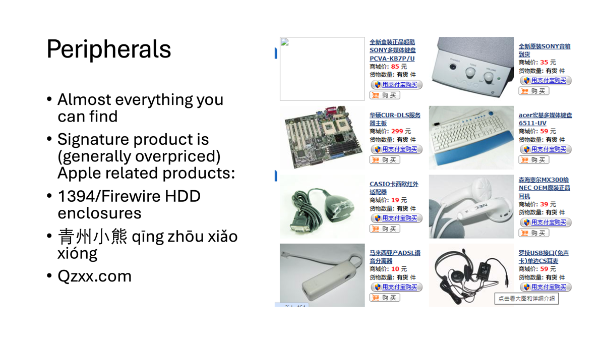 下一个市场是外设,几乎你能想到的任何东西都能在这里找到。其标志性产品通常是价格偏高的苹果周边产品,比如火线(Firewire)硬盘盒。其中一个最大的卖家是青州小熊(http://qzxx.com)。