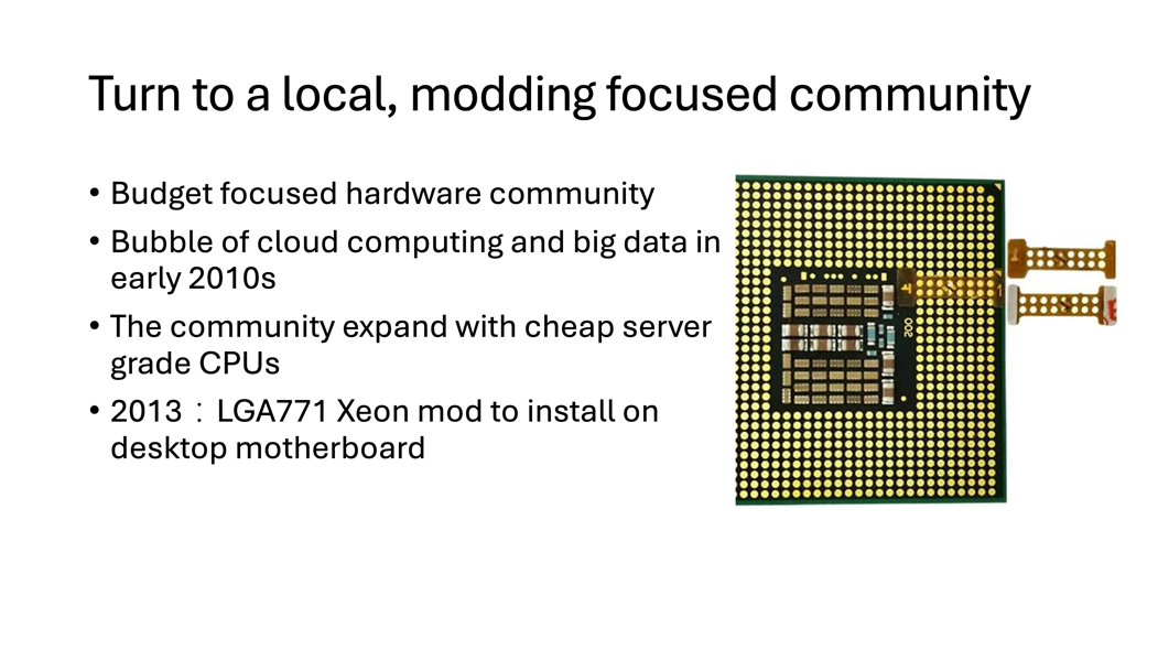 之后,最重要的转变是转向本地数据中心退役的服务器级硬件,特别是将服务器级CPU改装到桌面级主板上。就像图中的这个转换贴也叫“护舒宝”。如果你把这个转换贴贴在CPU上,就可以将服务器级的CPU移植到桌面级的主板上。