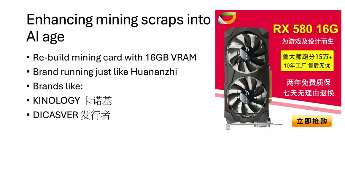 此外,矿渣显卡也被赋予了新的用途。比如制造商对原本用于挖矿的(RX580)显卡进行了改造,重新设计生产了一款16GB显存的显卡,适用于一些AI应用。这类显卡也有自己的品牌,比如卡诺基、发行者等等。