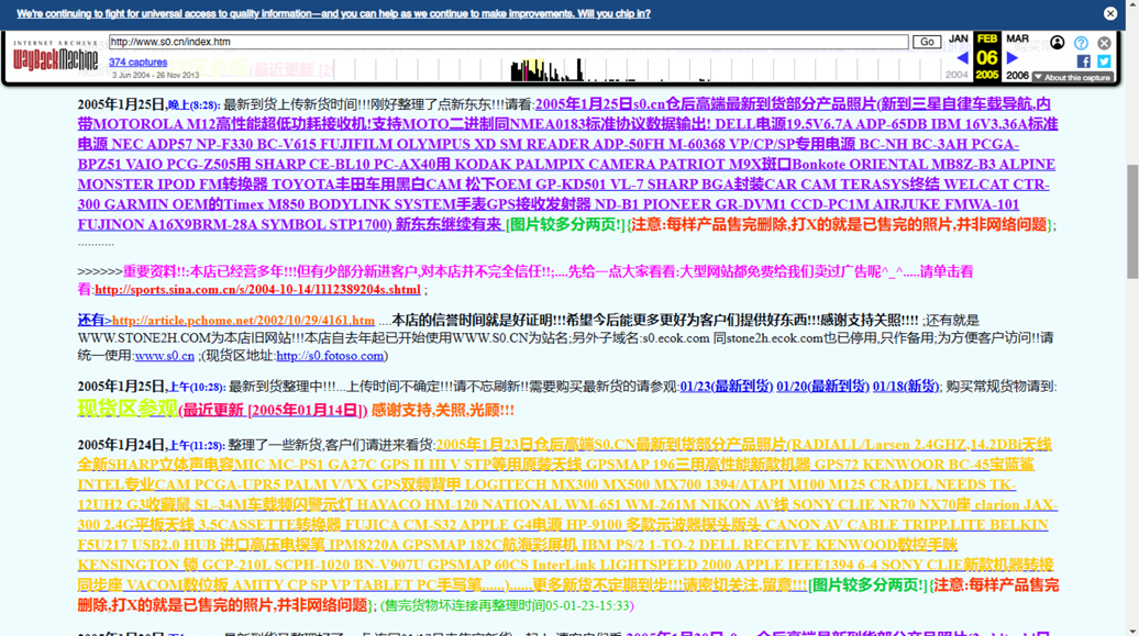 有一个庞大的、隐形的在线市场,专门处理电子废物,就像这个网页(石坚高端网,s0.cn)所展示的那样。这个截图是互联网档案馆2005年的存档,列出了很多电子产品,它们通常是从进口到中国的废旧电子产品中分拣出来的。转售商把这些货物都列在网站上出售。如果像我这样的爱好者想要购买,就需要和卖家联系并在线购买。