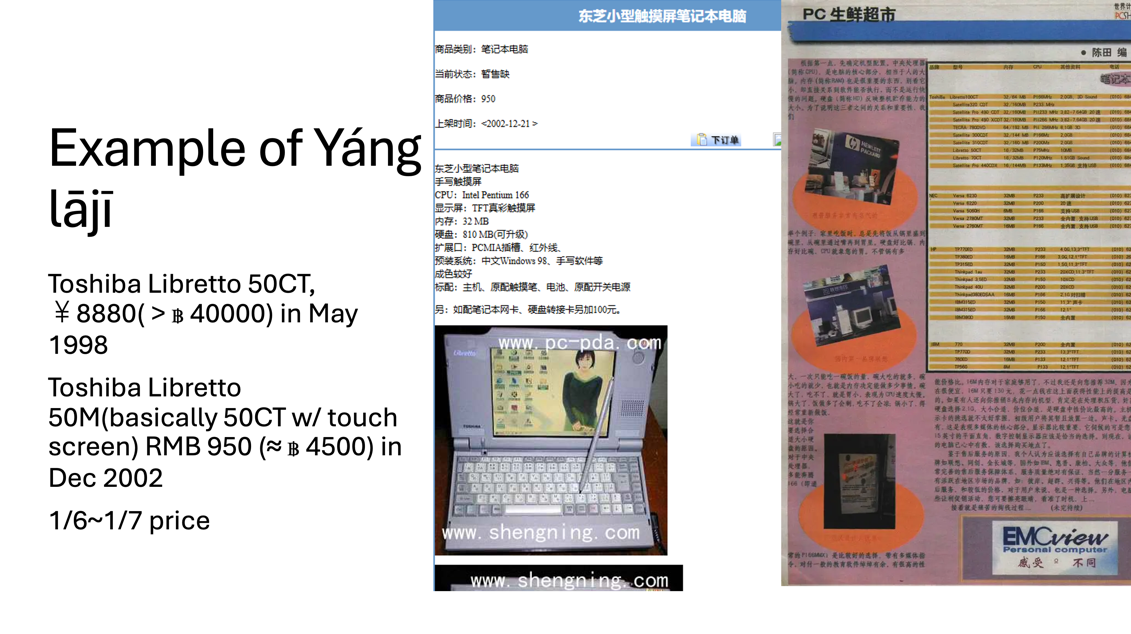 比如这款Toshiba Libretto 50ct,在它还在主流市场也就是一手市场上销售时,价格超过8000元人民币[4],折合大概40000泰铢。但仅仅过了4年,当它进入“洋垃圾”市场时常见的型号是 Libretto 50m,实际上是增加了触摸屏功能的Libretto 50ct,价格降到了大约950元人民币[5],大约是原价的1/6到1/7,非常便宜。