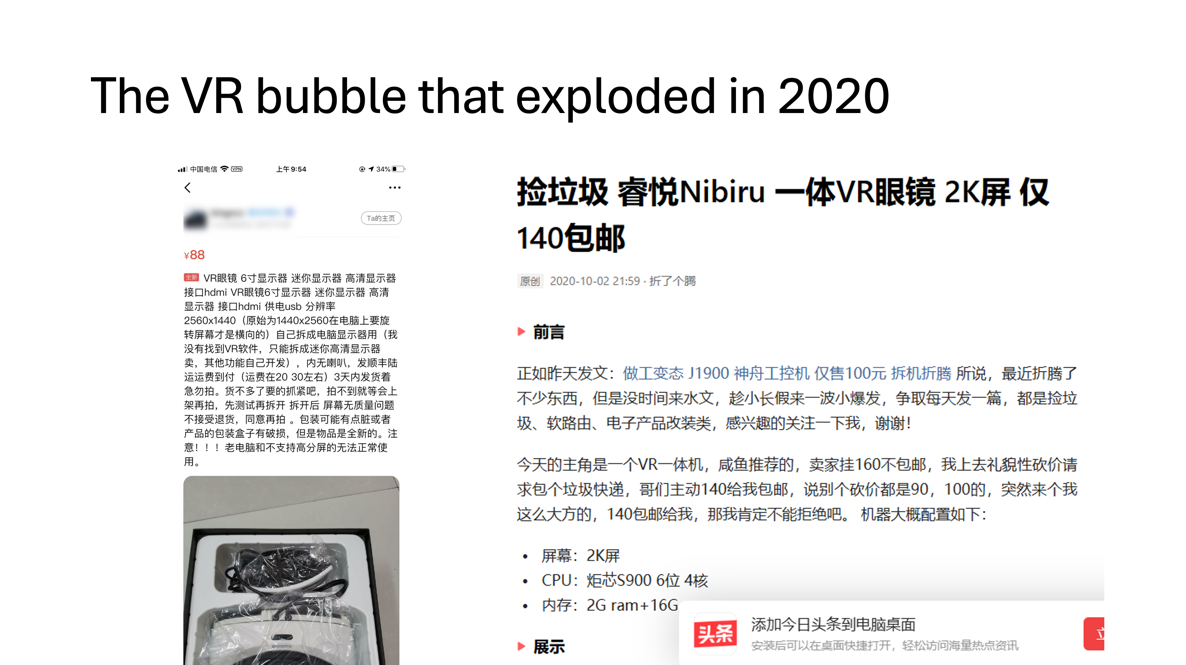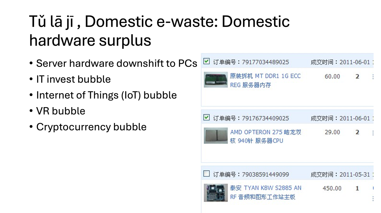 之后,“洋垃圾”市场开始下滑,而国内的废旧电子产品“土垃圾”开始崛起。图中这些AMD Opteron本来是服务器级别的硬件。但它们变得很便宜,并适合用来组装台式电脑。同时,“土垃圾”的崛起与一些IT投资泡沫有关,比如物联网(IoT)、虚拟现实(VR)或加密货币。当泡沫破裂时,许多非常便宜的硬件就进入了市场。