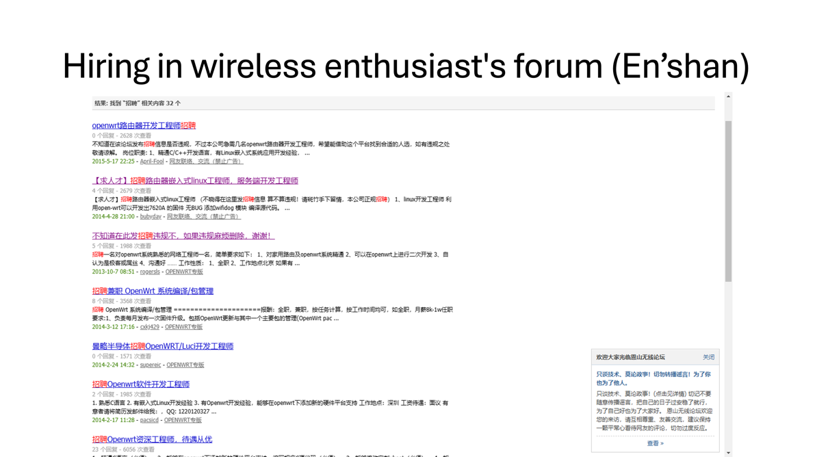 这个截图来自恩山无线论坛。类似的,如果你非常熟悉DD-WRT或OpenWrt之类的技术,你也可能会被聘用。