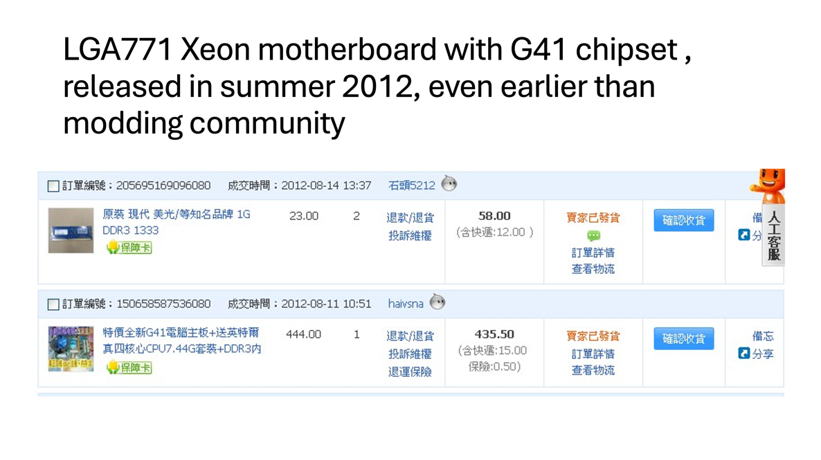 还有另一个例子,一些厂商设计主板时,并非是基于硬件爱好者社区中已有的设计,而是在社区之前就设计了他们自己的改版主板。例如 LGA771 Xeon主板出现在市场上的时间就早于图拉丁吧社区中对类似改装的讨论。早在2012年,一些G41芯片组的桌面级主板就已经支持服务器CPU。