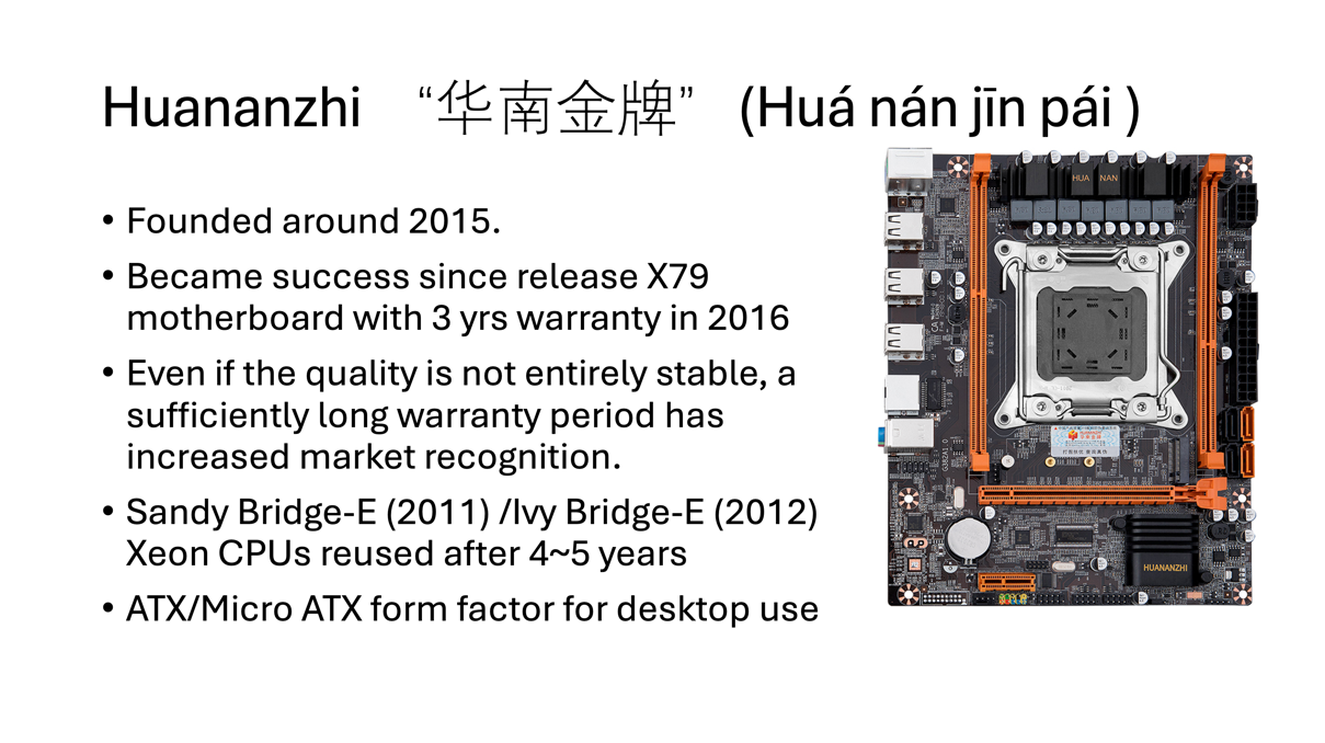 三年后,这类定制主板开始出现代表性的品牌,比如说华南金牌主板就大量出口到其他国家。他们获得成功的产品之一是2016年推出的X79主板。是什么让这款产品走向成功呢?因为他们提供了三年的保修期。即使当时质量还不稳定,但更长的保修期加上社区的支持,还是使他们的产品取得了认可。这款主板支持4~5年前的服务器级处理器,由于是退役的旧款服务器CPU,它们的售价变得很便宜,所以被用来组装台式电脑。