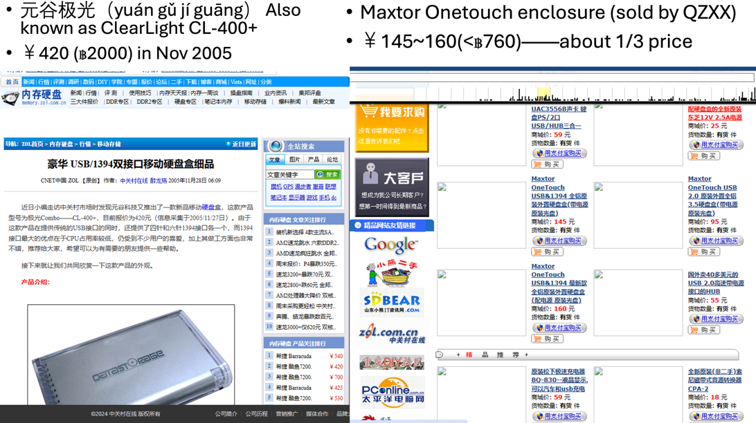 如果将官方市场和地下市场进行对比的话,2005年,如果你想为苹果电脑买一个火线硬盘盒。线下市场的价格大约是420元人民币。但如果你从青州小熊买,价格是原价的1/3,大约145元到160元人民币,具体价格取决于你选择的型号。