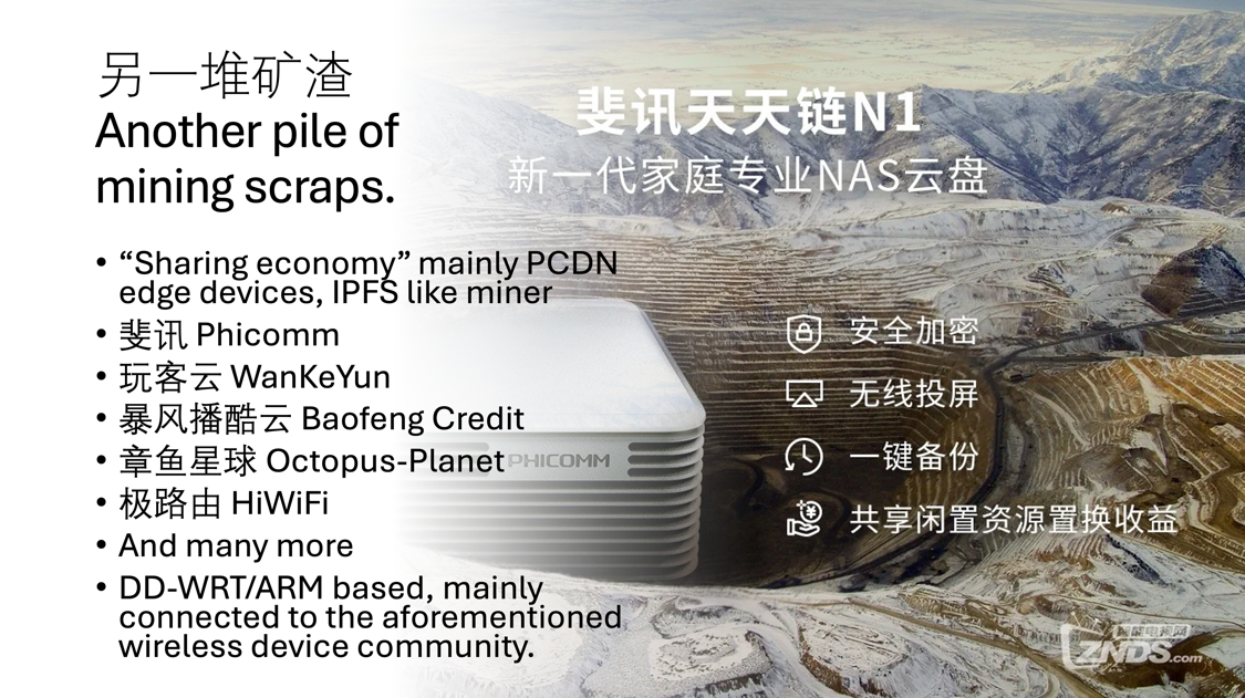 在2016~2018年左右,还有“另外一堆”矿渣,这段时期中国有很多关于“共享经济”(Sharing economy)的投资炒作,主要是PCDN边缘设备和类似IPFS系统的矿机。技术上来说,这些设备的硬件结构很像无线路由器。涉及到的品牌有很多,比如斐讯、玩客云 、暴风播酷云、章鱼星球、极路由等。当这些设备变成矿渣时,价格大约在¥100-200之间,非常便宜。大多数设备基于DD-WRT/OpenWrt/ARM架构,因此可以较容易地将定制Linux固件刷入这些设备。它们的性能相当不错,许多设备使用的是四核或双核CPU,其实是颇为强大的ARM嵌入式设备。这一社区与无线设备社区的联系非常紧密,恩山无线也是讨论这些矿渣的最大论坛。