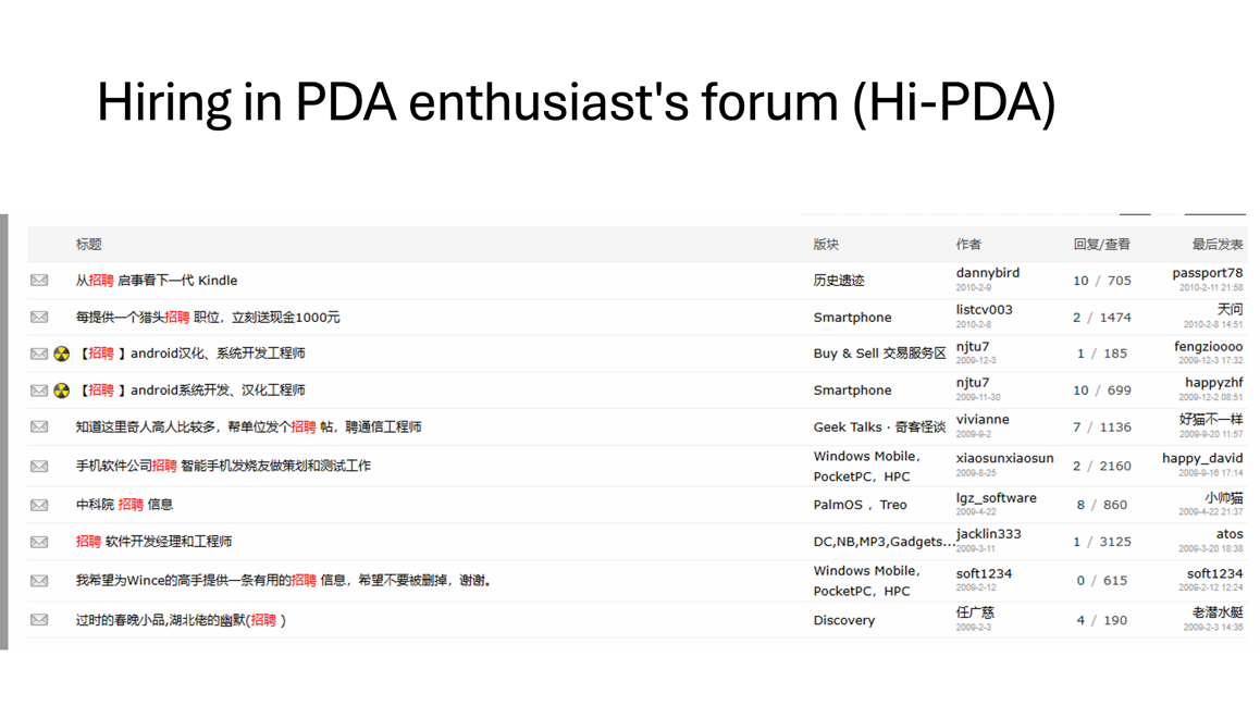 在一些论坛上,比如说Hi-PDA,就有关于PDA爱好者的招聘广告。如果你非常熟悉移动操作系统,比如Windows CE或Android,你就有机会在这里找到工作。