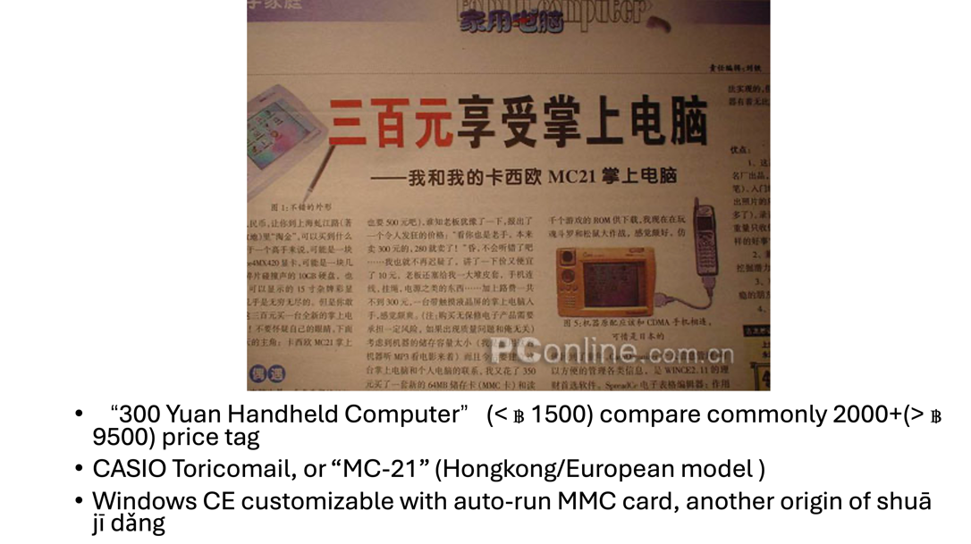 另一个“刷机党”文化的起源是一种售价通常为300元人民币上下的掌上电脑,叫做CASIO MC-21或Toricomail。它原本是作为手机配件出售的,用来通过GPRS或日本的PHS(即“小灵通”)网络发送电子邮件。但在中国市场上,它被高度定制化,用户可以使用自动运行MMC卡进行定制并运行自定义的软件组合,因此形成了“刷机党”的另一个起源。