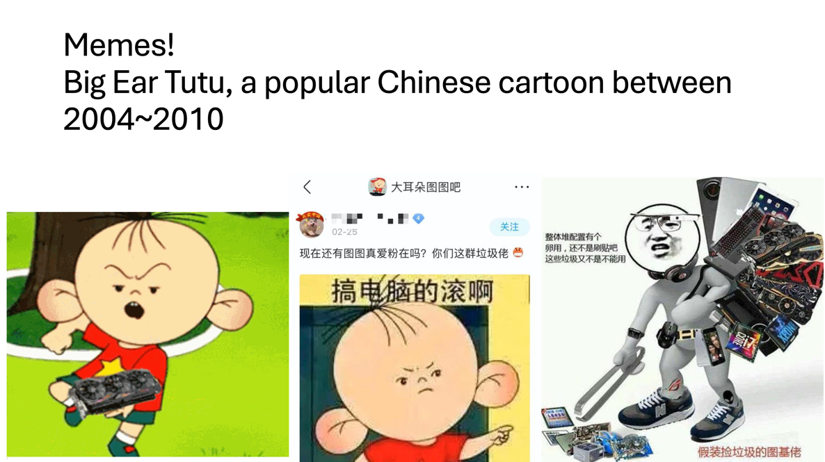 我理解这些网站,理解这些不同的社区。闪存社区可能与其他社区稍有不同,但它们以某种方式联系在一起。但最接近这种文化氛围的可能是 ear-tu-tu(注:指演讲中提到“大耳朵图图”的表情包),对吧?我们通过那个视频或者那个 迷因看到了,它并不是关于技术本身的,而是从这些技术中衍生出的某些东西。