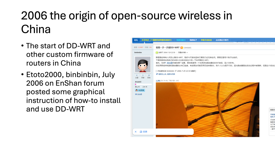 这个地下无线市场的一个重要贡献就是开源无线技术,比如DD-WRT和OpenWrt路由器固件在中国的普及。最重要的早期贡献者包括了Etoto2000和binbinbin,他们发布了一些图文教程[9],教人们如何在各种路由器上安装和使用DD-WRT。之后,围绕DD-WRT和OpenWrt这类开源无线固件出现了很多相关产品。
