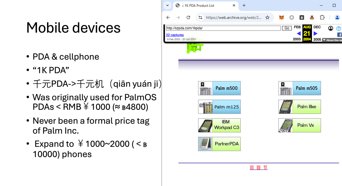 另一个细分市场是移动设备,就像刚才看到的Clie PDA。这个细分市场里的主要商品是PDA和手机,通常被称为“千元PDA”(1K PDA),即价格在1000元人民币左右,大约5000泰铢。这是2004年在深圳的一家叫“飞力”(szpda.com)的转售商网站。