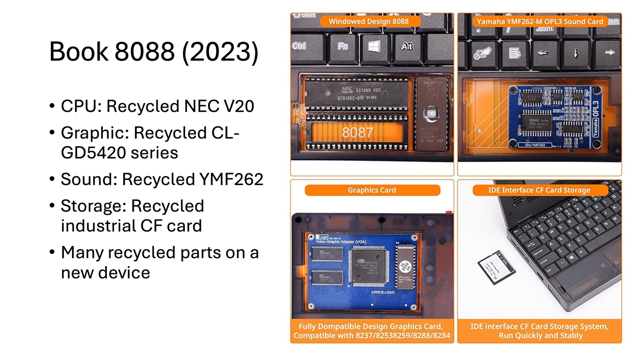 还有一款最新的产品是热门的复古计算机Book 8088。它的大多数芯片都是回收的,比如CPU是来自回收渠道的,与Intel 8088同级别的NEC V20;图形芯片是回收的CL-GD5420系列;声音芯片是回收的(YMF262),存储也是回收的(工业级CF卡),但主板和机器本身是全新设计的。所以它是一个由许多回收部件组成的新设备。