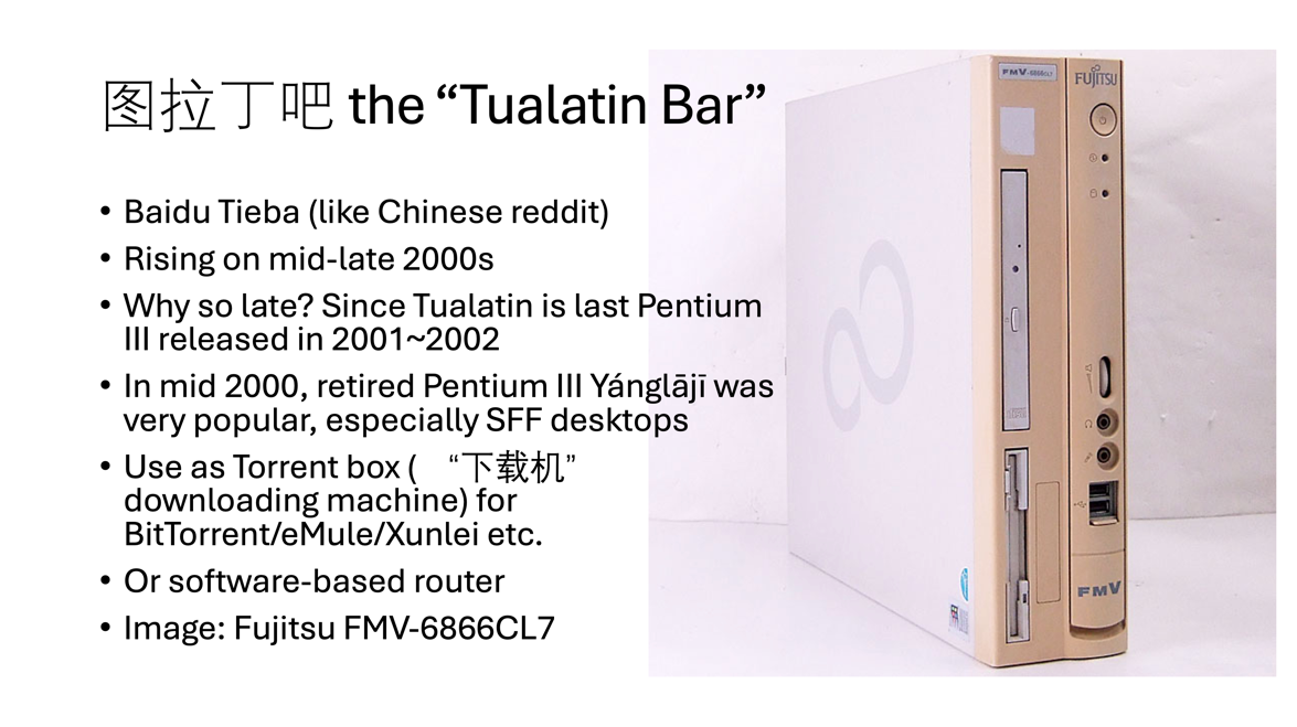 在中国,讨论“土垃圾”最重要的在线社区,是图拉丁吧。它是百度贴吧的一部分(类似中国版的Reddit),大约在2000年代中后期开始兴起。但为什么这么晚呢?毕竟Tualatin是2001到2002年发布的最后一款Pentium III处理器(在图拉丁吧活跃时这款处理器已过时多年)。