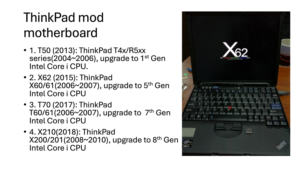 这里还有一些更贵一些、但更高度定制的例子,比如ThinkPad改装主板,来自我刚刚提到的在线论坛“专门网”(51nb,http://ibmnb.com)社区。T50是基于ThinkPad T4x改装的,X62是基于ThinkPad X60改装的。通常,这些改装的目的是将原有的CPU和主板从大约8到10年前的硬件升级为新硬件,提供新的CPU和主板新芯片组的功能。