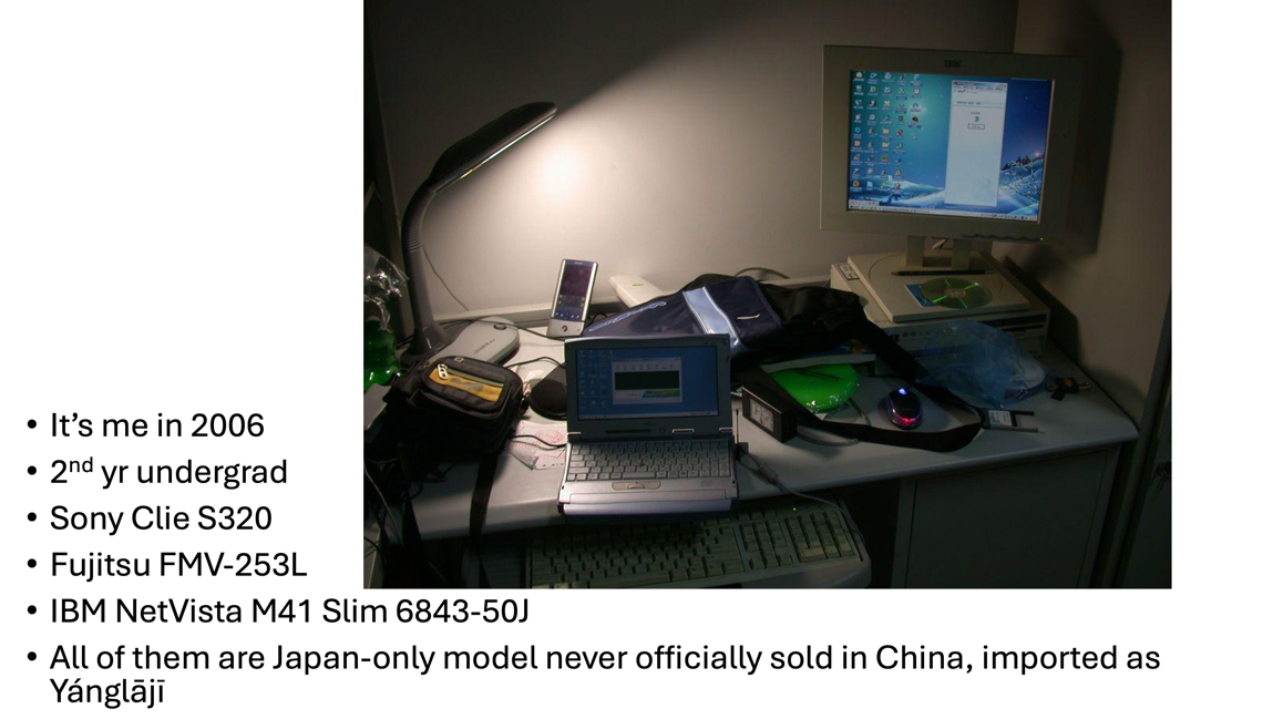 这张照片是我个人生活经验的一部分,是我本人在2006年拍摄的,那时我还是大二的学生,手头有很多这些东西,大多是日本品牌的。比如IBM的NetVista M41,它是日本特供的小型机箱台式机,还有富士通的FMV,它是日本的超小型笔记本电脑,还有Sony的Clie PDA。这些设备都是日本特供产品,但它们也都通过平行进口进入到中国,在当时,这种情况非常普遍。