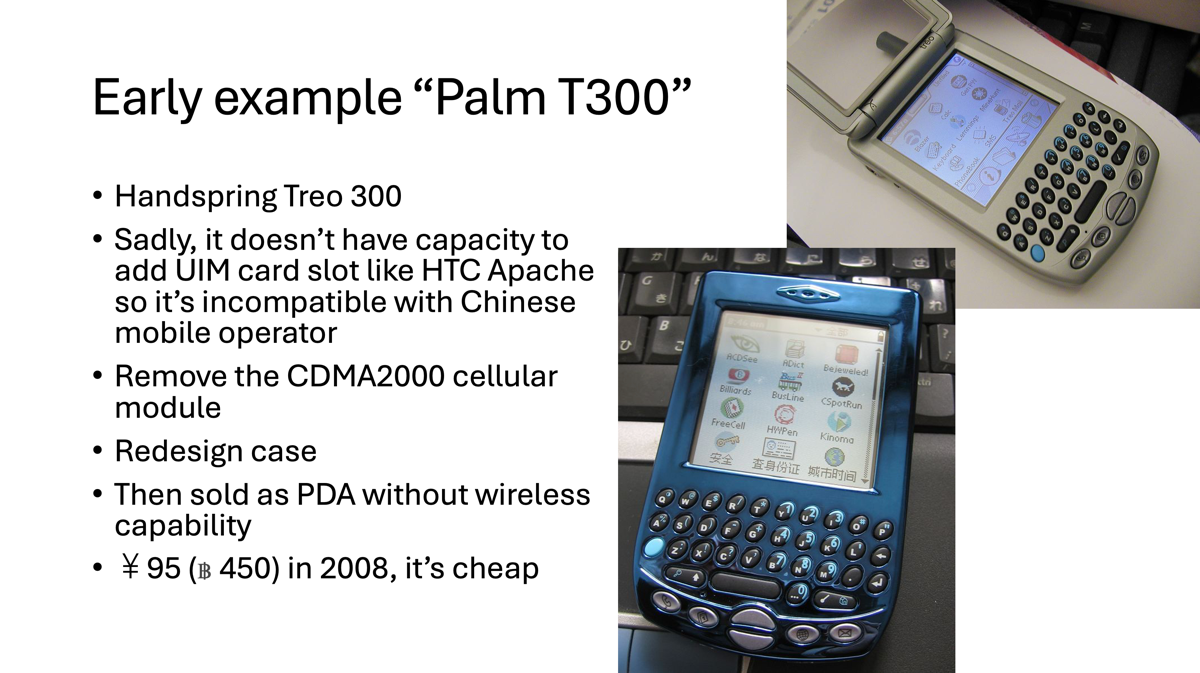 “Palm T300”是中国厂商重新制造产品的最早例子之一。当时,Handspring Treo 300 是一款智能手机,作为“洋垃圾”进口到中国。可惜它不能像HTC Apache 那样被改装,因为它的蜂窝模块没有支持SIM卡或UIM卡的潜力。那么中国制造商是怎么做的呢?他们直接拆除了蜂窝模块,重新设计了外壳。就像图中灰色是原版的设备,蓝色是重新设计的版本。然后,他们将主板、显示屏和键盘放进新的设计外壳里,并将其作为没有无线功能的PDA出售,价格非常便宜,2008年仅售¥95元[12]。