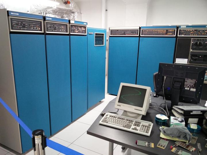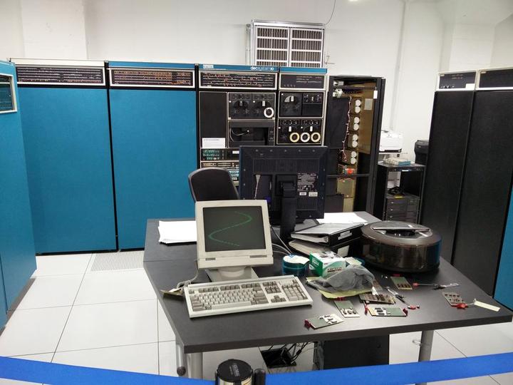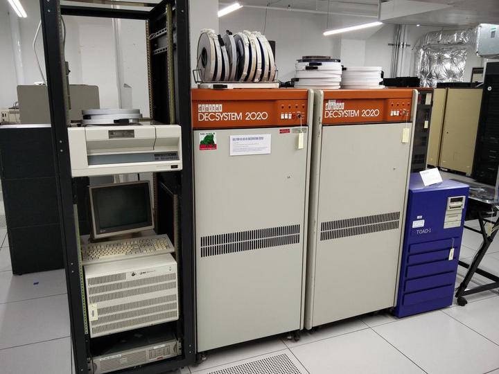 蓝色边框的柜子应该是另外一台PDP-10系列电脑,而机柜的尽头是一台TU 56磁带机,可能是用于启动大型主机的PDP-11前置机的一部分。