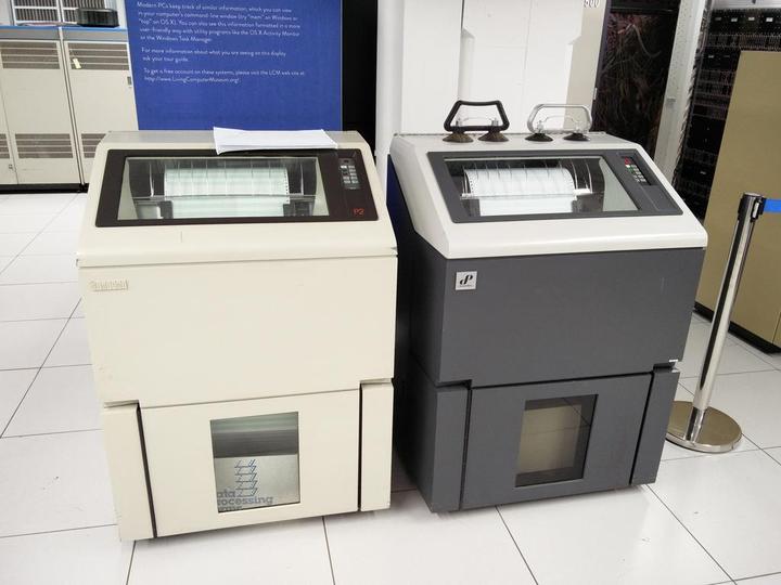 Dataproducts BP-1500打印机(右),及其OEM版本DEC LP-27,对于高分辨率显示器仍然相当昂贵的80年代,“打Log”(打印日志)和输出结果这样的工作往往都是由这些高速的宽幅打印机完成的,BP-1500每分钟可以打印1500行,是程序员们调试程序的好帮手。