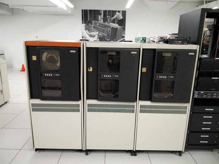 上图中是使用Massbus总线的磁带机TU77和TU78,存储密度分别为1600bpi(bit per inch - 比特每英寸)和6250bpi,一盘2400英尺的磁带可以存储40MB或145MB。下面这张照片可以看到磁带机内部复杂的结构。
