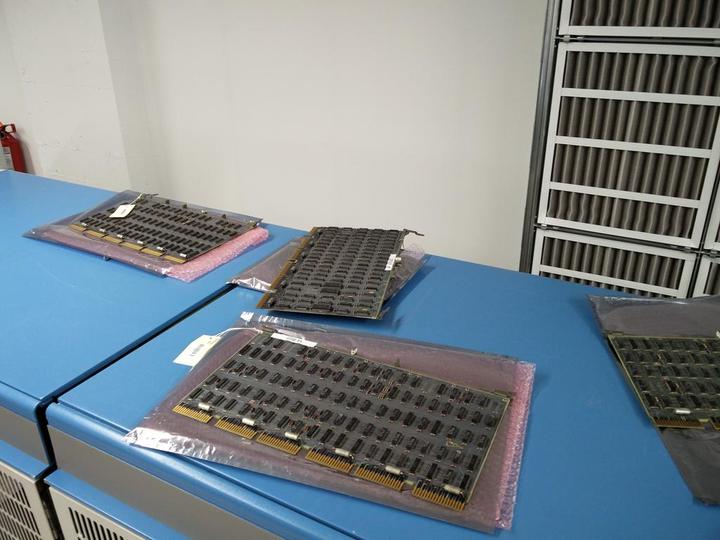 下图中蓝色亮灯的大柜子,都是PDP-10的内存模块,每个内存模块的容量是16K words(36-bit字,约合72KBytes),在当时,半导体内存仍不流行,这些巨大的内存模块都是磁芯内存,而磁芯内存的发明者,正是著名的华人科学家王安。