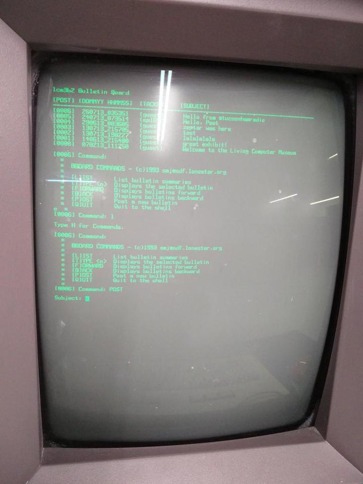 下图中展示的BBS系统,是世界上最大的Unix shell提供商SDF(Super Dimension Fortress 超时空要塞)的公告板系统bboard,现在SDF主要提供NetBSD系统的shell服务,同时也提供TWENEX(TOPS-20)和Symbolics Genera(用于Lisp机器 - Lisp machines的操作系统)。
