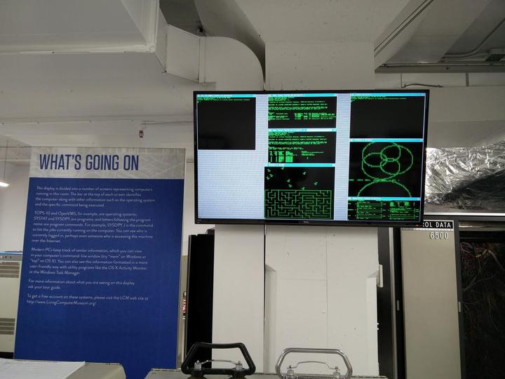 在空调房中间的大屏幕上,显示着目前正链连接在因特网上的主机正在运行的程序。时至今日,对PDP有兴趣的爱好者仍然可以填写申请表获得可以远程登陆到博物馆内收藏的大型主机的账户。Request a Login