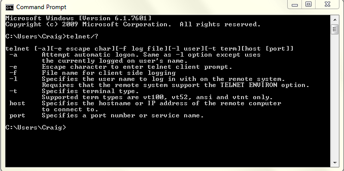 在开始之前最好确认一下我们的Windows系统里是否已经安装了Telnet命令,因为从Windows 7开始Telnet命令就不是默认安装的功能了。打开命令提示符然后输入telnet/?命令之后按回车键。