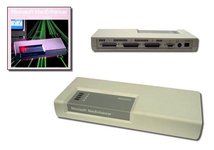 对于今天的用户来说这可能有些不可思议,但事实上1980年代的微软是Macintosh平台最为有力的支持者之一,作为一系列支持Macintosh的产品之一,微软发布了MacEnhancer这样一款相当实用的扩展坞。MacEnhancer可以通过Mac的调制解调器或者打印机接口提供一个IBM PC兼容型并行端口和两个IBM PC兼容串口。使用MacEnhancer和配套的软件,Mac用户可以使用许多为PC设计的打印机、调制解调器等一系列配件。