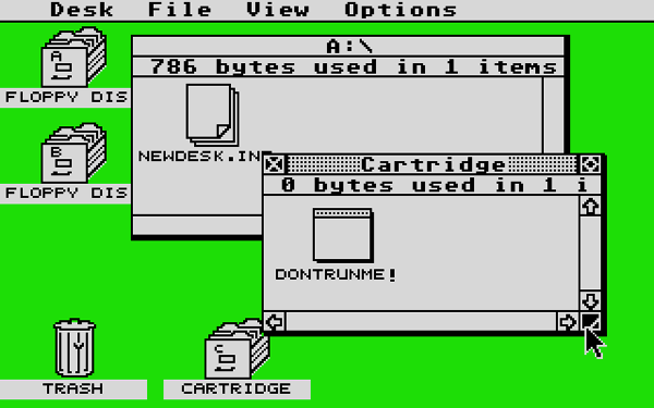 不过对于Atari ST来说,一个巨大的加分项是它的操作系统——TOS(通常解释为The Operating System或Tramiel Operating System的缩写)。TOS操作系统被硬编码在机器的ROM芯片上,有着窗口化的GEM界面 - 一款类似于Mac OS的图形界面。针对个人电脑开发的GEM有着许多我们今天所熟悉的直观元素。