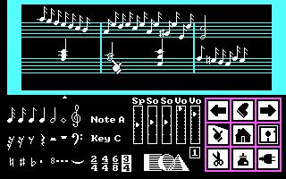 《Music Construction Set》实现了几乎被认为是不可能完成的功能:同时演奏四个音符并且几乎听不出顿挫感。虽然声音的质量有一点“模糊”,但你仍然可以清晰地听到构成声音的细节。