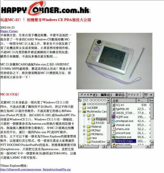 最早发现这款产品利用价值的,是来自于香港的玩家,2002年四月,香港玩家Happy Corner的一篇卡西欧MC-21活用帖《玩盡MC-21!!相機變身Windows CE PDA秘技大公開》,是目前互联网上能找到的最早的MC-21应用教程,代表着中文掌上电脑社区第一次发掘这款设备的价值。在此之前,MC-21在香港仅仅是作为“生果台”Orange(即后来的香港3G)为西门子手机推出的照相机配件。而在这篇帖子中,MC-21摇身一变,成为一款功能丰富的掌上电脑。