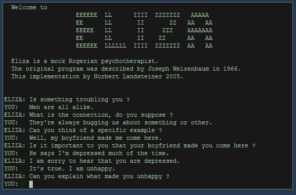 【ELIZA effect - 伊莉莎效应】人类对人工智能模拟不合理的依赖,即使人类明知到对方是机器。2015年的电影《机械姬》就是一个很好的例子。ELIZA是一个古老的聊天机器人,它可以模拟一个罗杰斯学派的心理医生,并被巧妙地嵌入在理查德·斯托曼的EMACS编辑中。