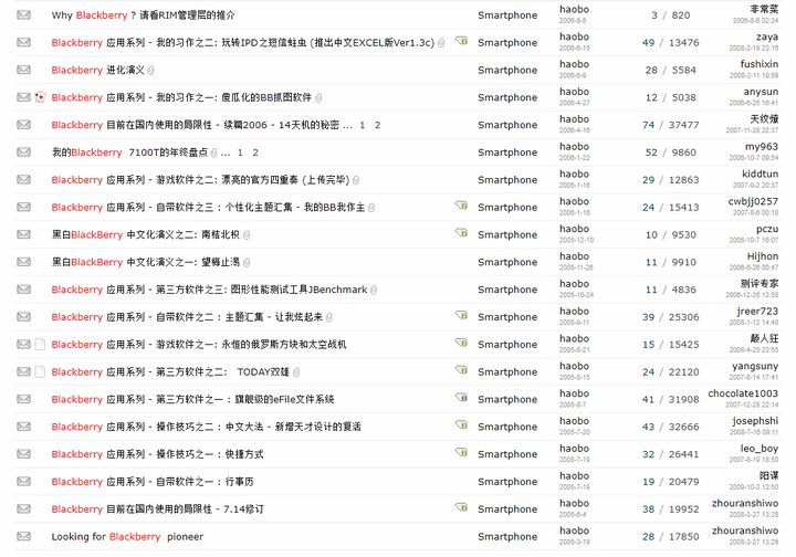 在之后的半年间,haobo在Hi-PDA和TomPDA发布了“Blackberry应用系列”,向中文社区展示了黑莓7230、7290上的一系列应用软件,并且向手中有Blackberry的国内玩家提供付费的汉化服务,逐渐在大陆的PDA社区中聚集起一小批最早的黑莓玩家。