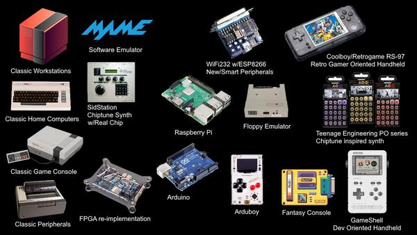 在老式电脑旁边的一列,都是基于老式设备开发的新产品,比如可以模拟很多不同老式电脑和游戏机的MAME模拟器,以及SID Station合成器,它使用的是Commodore 64同款的声音发生芯片,是基于Commodore 64硬件开发的一款独立的电子音乐合成器。此外我们还可以看到MiST它是从Amiga电脑的FPGA重制版本Minimig发展而来的,而我们前面提到的MiSTer,则又是在MiST的基础上开发的。