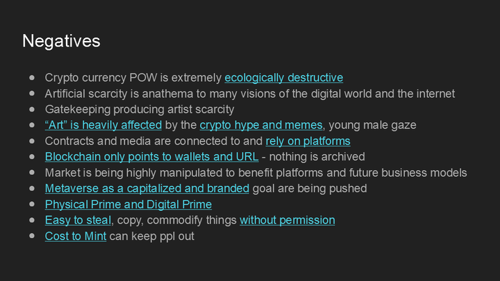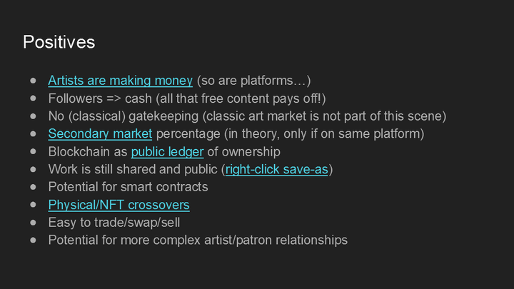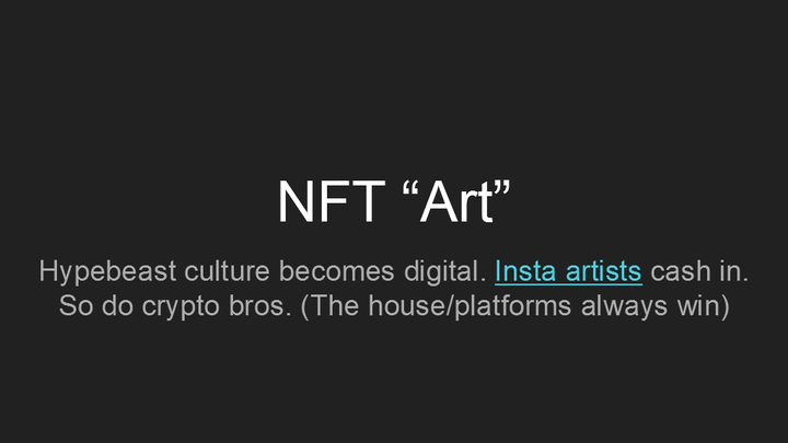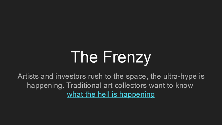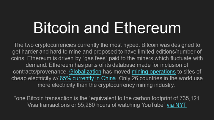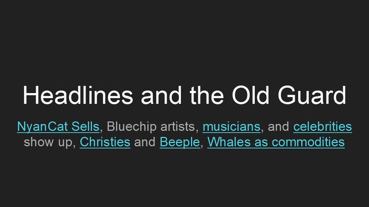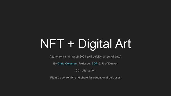 针对近来艺术界热议的NFT和“加密艺术”等话题,丹佛大学新兴数字实践专业的Chris Coleman教授在三月中旬制作了一份PPT,总结了近期NFT的发展状况,也反映出数字媒体学者相比运营者和投机者对此更为客观的思考。我的中文翻译力求尽量忠实于原版,并以更适合顺序阅读的方式排版,将嵌入在正文中的链接单独列出,并对链接的文章进行注释。