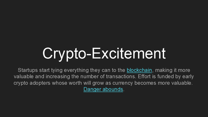 初创公司开始将他们能做的一切与区块链挂钩,使其涨价并增加交易量。这种动力来自于加密货币早期使用者的资助,他们的资产也将随着货币的升值而增加。但这其中危机四伏。
