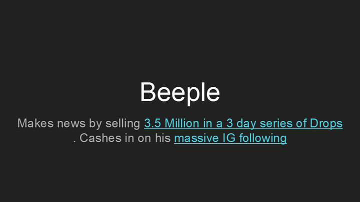 关于Beeple销售超过350万美元的报导:https://loopifyyy.medium.com/the-proof-of-nfts-3-5m-beeple-drop-37955867d789