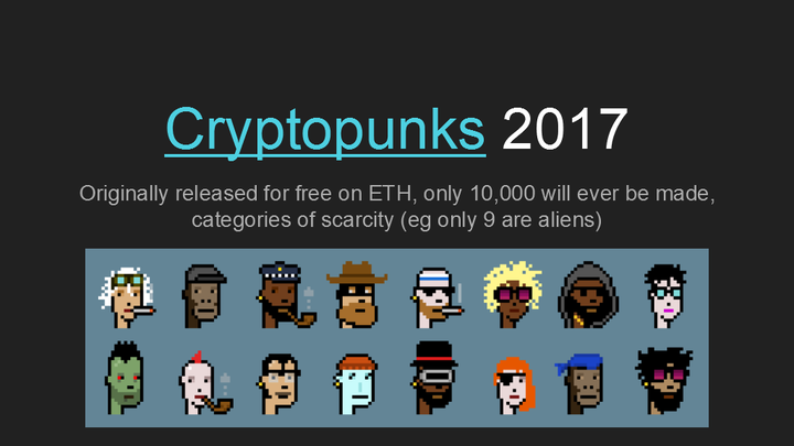 最初在ETH上免费发布,限量行一万个,以稀缺性为特点(例如只有9个是外星人)。